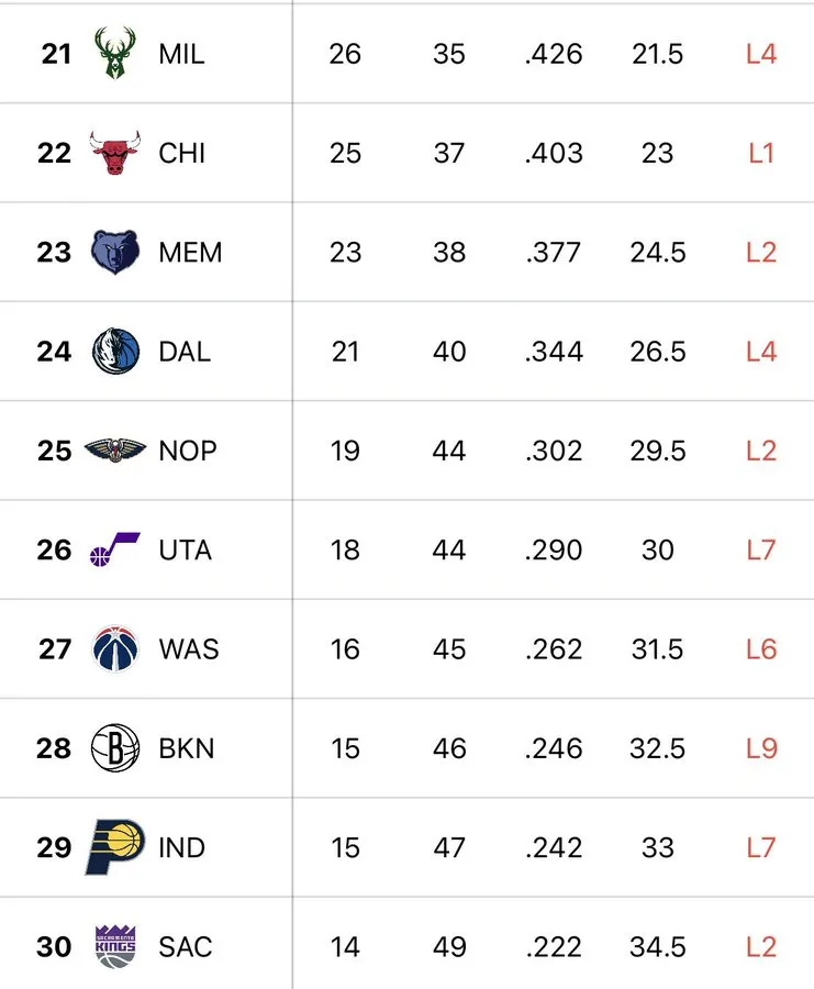 值得一提的是,联盟中最差的十支球队目前累计已遭遇44连败。